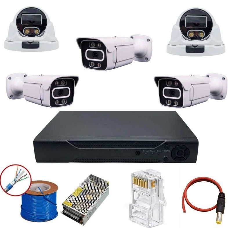 پک کامل مداربسته 5دوربین فلزی ضد اب 5مگاپیکسل IP تحت شبکه با 50m کابل رایگان دید در شب رنگی پلاک خوان