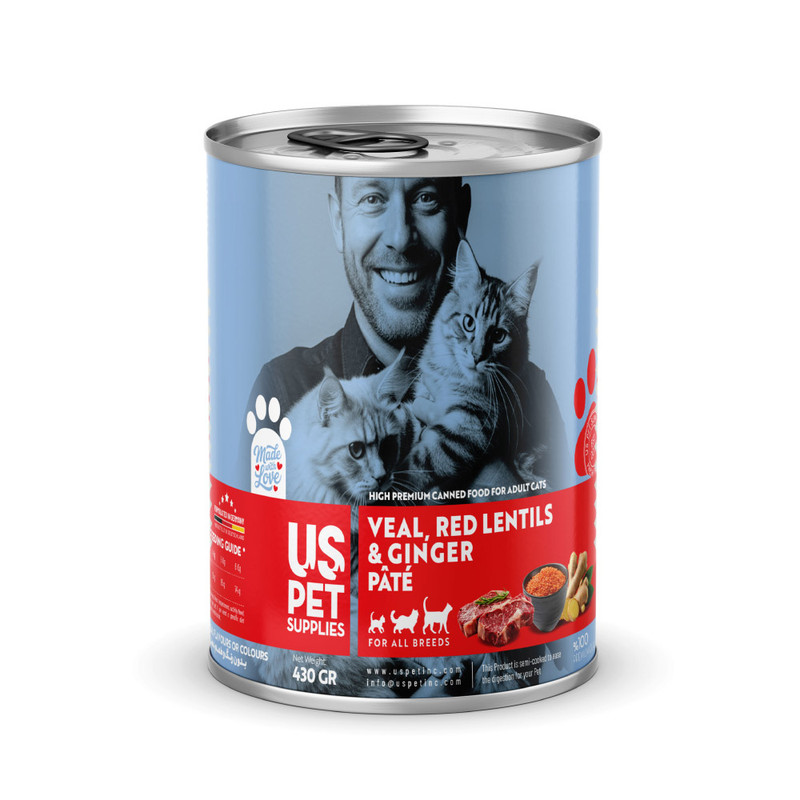 کنسرو غذای گربه بالغ یو اس پت مدل هایپریمیوم طعم گوشت گوساله و عدس قرمز و زنجبیل وزن 430 گرم