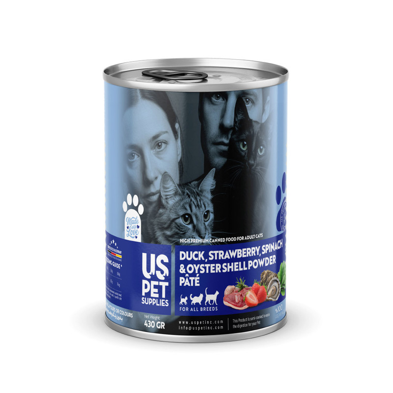 کنسرو غذای گربه بالغ یو اس پت مدل های پریمیوم طعم اردک، اسفناج، توت فرنگی و پودر صدف – وزن 430 گرم
