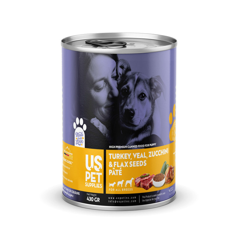 کنسرو غذای توله سگ یو اس پت مدل های پریمیوم طعم گوشت گوساله و بوقلمون وزن 430 گرم