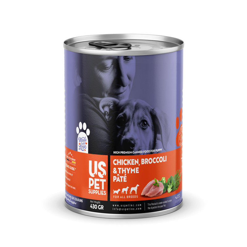 کنسرو غذای توله سگ یو اس پت مدل های پریمیوم طعم مرغ و کلم بروکلی وزن گرم