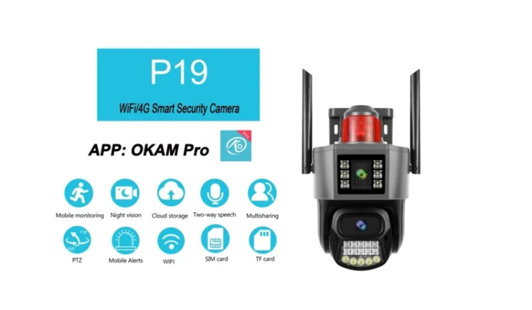 دوربین مداربسته سیمکارتی دو لنز مدل P19-4G بدون محدودیت در اپراتور با سرعت بالا ( اپلیکیشن O-KAM PRO )