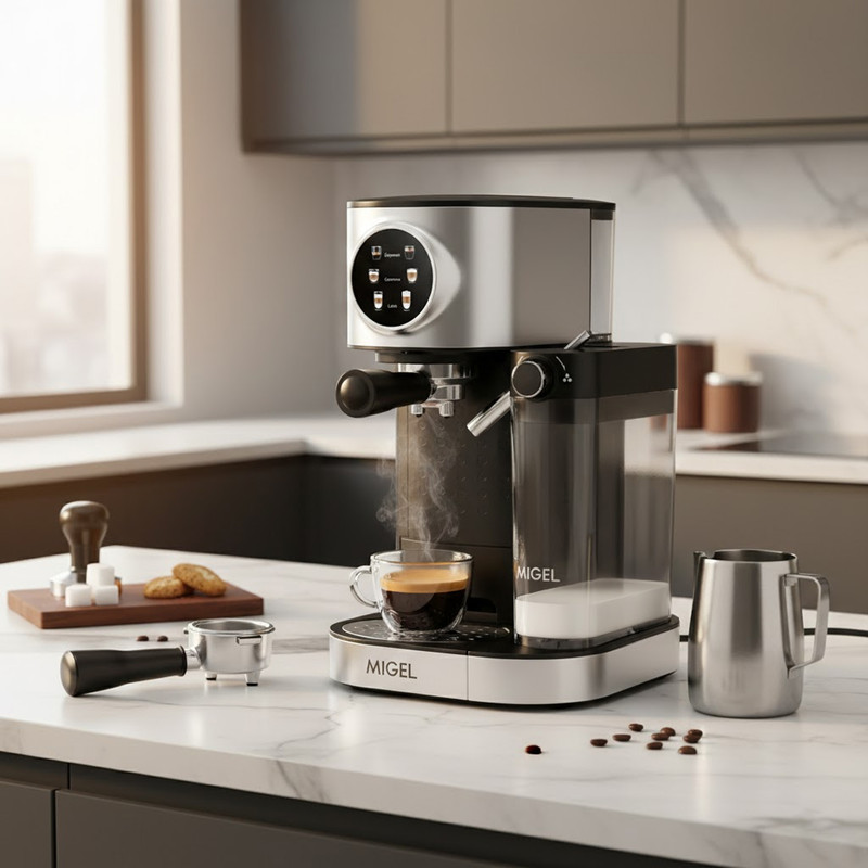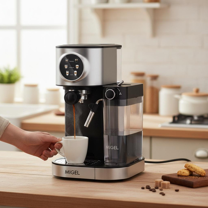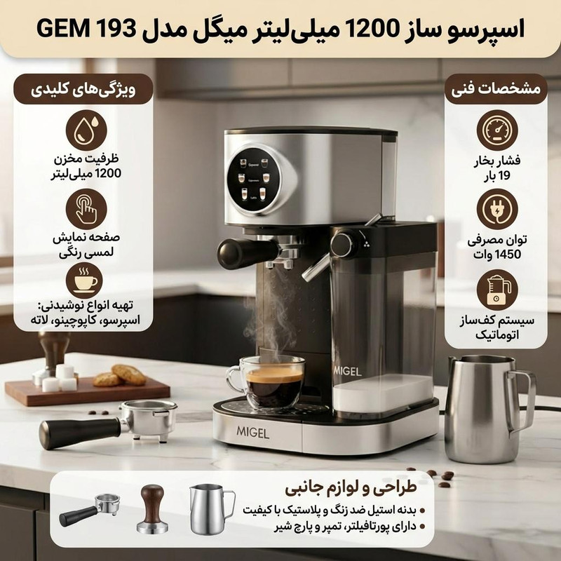 اسپرسو ساز 1200 میلیلیتر میگل مدل GEM 193 یک دستگاه تمام اتوماتیک مناسب استفاده خانگی است که با ترکیب توان 1350 وات، فشار بخار 20 بار و سیستم گرمایشی ترموبلاک، فرآیند تهیه نوشیدنیهای بر پایه اسپرسو را با سرعت و کیفیت بالا انجام میدهد. بدنه اسپرسو ساز 1200 میلیلیتر میگل مدل GEM 193 از استیل و پلاستیک ساخته شده و طراحی آن در ابعاد 30x22x18 سانتیمتر و وزن 4.6 کیلوگرم، نصب و استفاده روزانه را ساده میکند. مخزن آب با ظرفیت 1200 میلیلیتر به صورت جداشدنی طراحی شده و تمیز کردن آن آسان است. استفاده از پودر قهوه در اسپرسو ساز 1200 میلیلیتر میگل مدل GEM 193 امکان تهیه اسپرسوی استاندارد را فراهم میکند و نبود مخزن پودر یا دانه قهوه، عملکرد دستگاه را ساده و بدون پیچیدگی نگه میدارد.