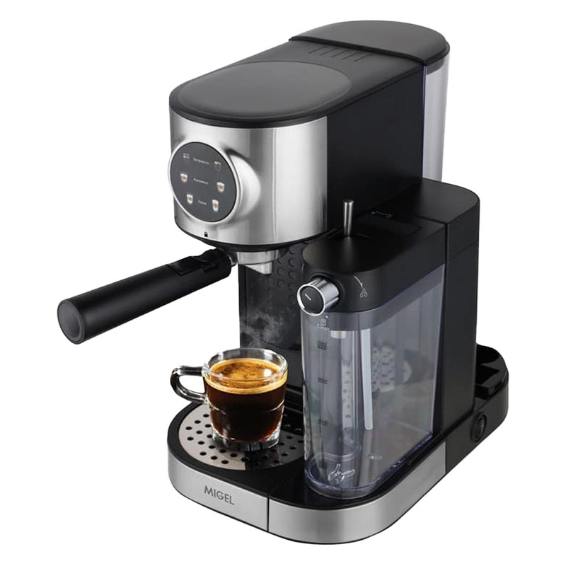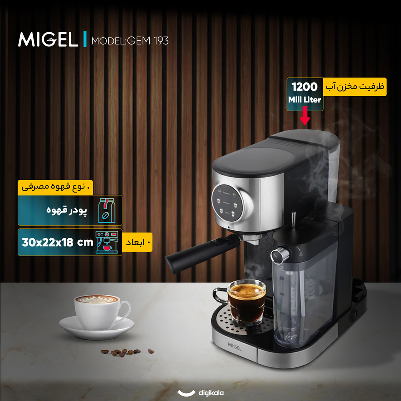 وجود مخزن شیر 700 میلیلیتر و سیستم اتوماتیک کف ساز شیر، قابلیت تهیه کاپوچینو و کافه لاته را با کیفیتی یکدست فراهم میکند. اسپرسو ساز 1200 میلیلیتر میگل مدل GEM 193 دارای دو نازل قهوه است و این موضوع تهیه همزمان دو فنجان را ممکن میسازد. منوی دستگاه شامل اسپرسو، کاپوچینو، کافه لاته و امریکانو است و عملکرد توزیع آب جوش، کاربرد دستگاه را برای تهیه نوشیدنیهای متنوع گستردهتر میکند. صفحه نمایش لمسی وضعیت عملکرد را به صورت شفاف نمایش میدهد و کاربری دستگاه را روانتر میکند.
