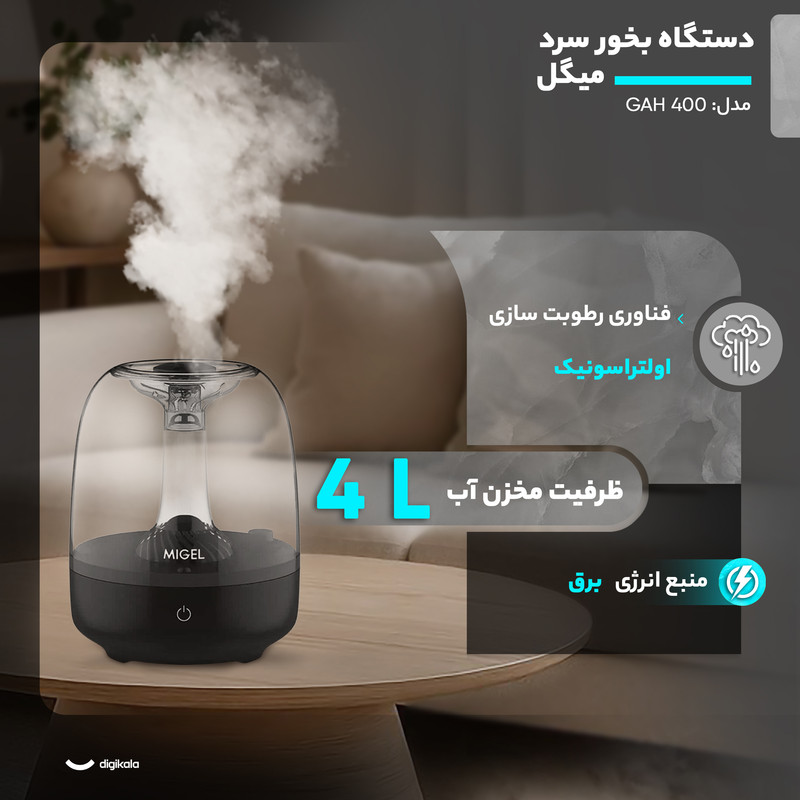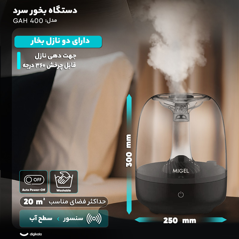 دستگاههای رطوبتساز یا بخور سرد از پرکاربردترین محصولات در فصول سرد سال هستند. این دستگاهها با فناوری اولتراسونیک و مصرف بسیار کم برق، آب مایع را به بخار تبدیل کرده و محیط اطراف را مرطوب میکنند. یکی از جدیدترین مدلهای با کیفیت، رطوبتساز و بخور سرد میگل مدل GAH 400 است که دارای مخزنی با گنجایش ۴ لیتر میباشد و امکان تنظیم میزان خروجی بخار را نیز دارد. این دستگاه میتواند محیطی تا حداکثر ۲۰ متر مربع را برای ۱۲ تا ۱۶ ساعت مرطوب نگه دارد. توان مصرفی حداکثر ۲۶ وات بوده و صدای تولیدی بسیار کم است، بنابراین استفاده طولانیمدت و حتی در اتاق خواب در طول شب بدون مزاحمت امکانپذیر است. کلید لمسی هوشمند دستگاه علاوه بر روشن و خاموش کردن، امکان کنترل چراغ خواب در حالتهای مختلف و ۷ رنگ را فراهم میکند. سیستم ایمنی دستگاه بهگونهای طراحی شده که در صورت اتمام آب مخزن، رطوبتساز به صورت خودکار خاموش میشود.