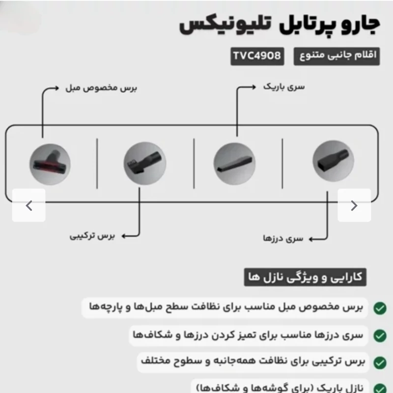 مخزن گرد و غبار با ظرفیت 0.6 لیتر برای تمیزکاری مداوم بدون نیاز به تخلیه مکرر مناسب است. از ویژگی های برجسته این مدل میتوان به سطح صدای پایین 79 دسی بل و قابلیت تمیز کردن سطوح مرطوب اشاره کرد با وجود اقلام همراه متنوع مانند نازل شکاف گیر برس مبل و تی گردگیر این جارو برقی به طور کامل نیازهای نظافتی شما را برطرف میکند. برای خرید جارو برقی تلیونیکس با قیمت مناسب این مدل انتخابی بی نظیر است