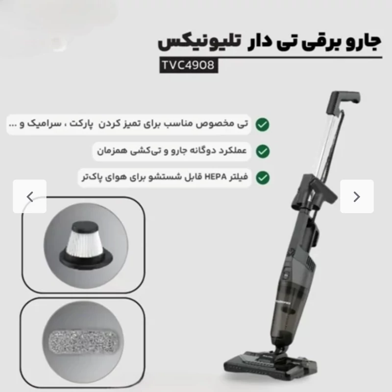 و برقی ایستاده و طی دار تلیونیکس مدل TVC4908 گزینه ای ایده آل برای تمیزکاری کامل خانه است. این دستگاه با قدرت مکش 18 کیلو پاسکال و موتور مسی 600 وات عملکردی قدرتمند ارائه میدهد. فیلتر HEPA قابل شستشو گرد و غبار و آلاینده ها را به طور موثر جذب میکند و هوایی پاکیزه تر به ارمغان می آورد.
