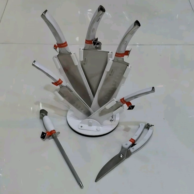 ویژگیها: تیغههای فولادی، دستههای یکسره، پایه چرخشی، و شامل اقلام مختلفی مانند چاقوی پوستکن، چاقوی سبزیجات، چاقوی چندمنظوره، چاقوی سرآشپز، ساطور، سوهان تیزکن و قیچی آشپزخانه.