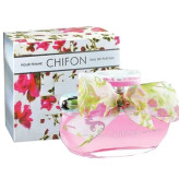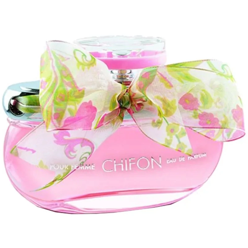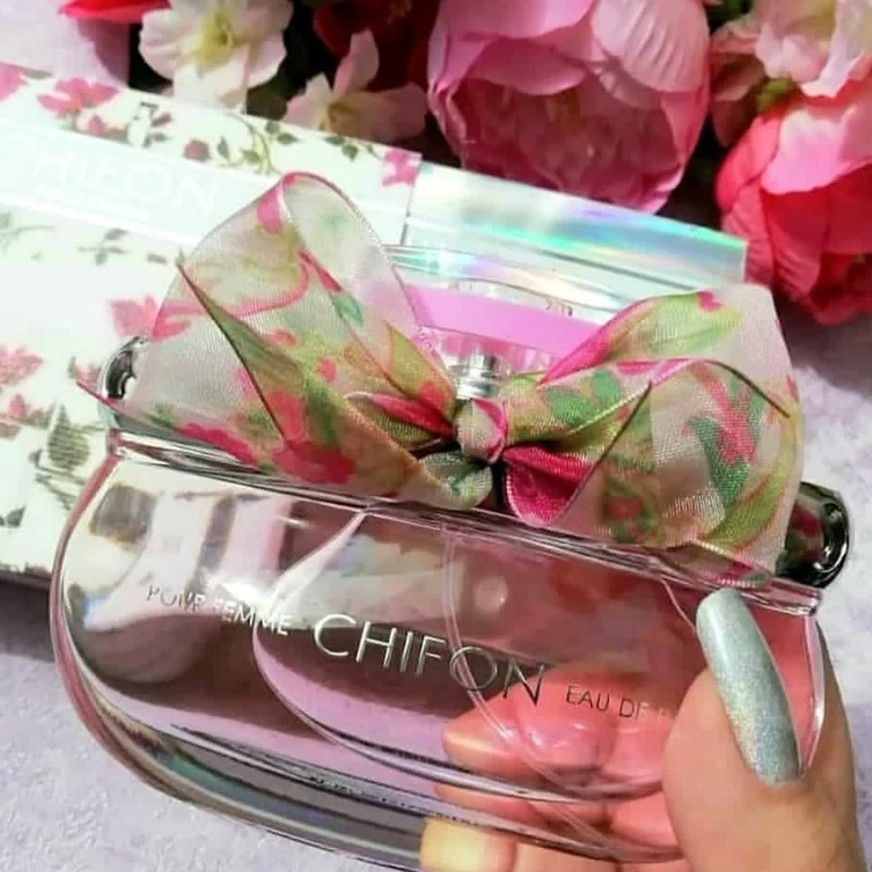 دور گردن بطری یک پارچه ی رنگی به شکل پاپیون قرار گرفته که به نقش گلها مزین شده است. روی شیشه نام CHIFON با رنگ تیره و فونتی ساده حک شده که به راحتی قابل مشاهده است. اگر قصد تهیه کردن یک هدیه برای عزیزانتان را دارید