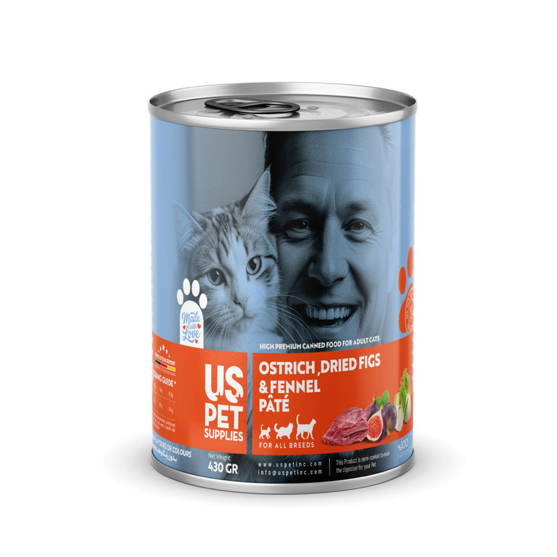 کنسرو غذای گربه بالغ یو اس پت مدل های‌پریمیوم طعم شترمرغ، انجیر و رازیانه وزن 430 گرم