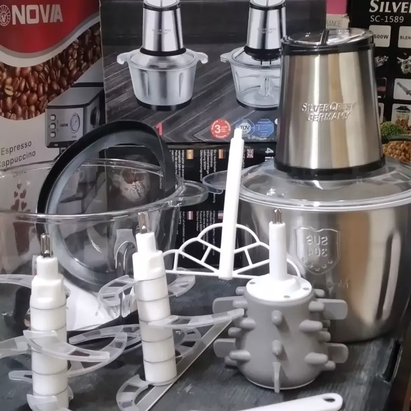 دوسال گارانتی ظرفیت 4کیلو دوعدد کاسه شیشه و کاسه استیل یک عدد تیغ سیر پوست کن تیغه 6تایی بدنه تمام استیل قدرت 3000 وات مناسب کوشت .سبزیجات . مرغ . خشکبار