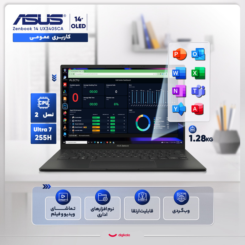 لپتاپ ASUS Zenbook 14 UX3405CA‑U7512 یک اولترابوک حرفهای، سبک و بسیار خوشساخت است که برای کاربریهای روزمره پیشرفته، طراحی سبک، تولید محتوا، امور اداری سنگین و استفاده خلاقانه بهینهسازی شده است. وزن تنها ۱.۲۸ کیلوگرم و ضخامت ۱۴.۹ میلیمتر، این مدل را به گزینهای ایدهآل برای حمل روزانه تبدیل میکند. بدنه با کیفیت بالا و طراحی مینیمال، حس دستگاهی ممتاز و مدرن را منتقل میکند.
