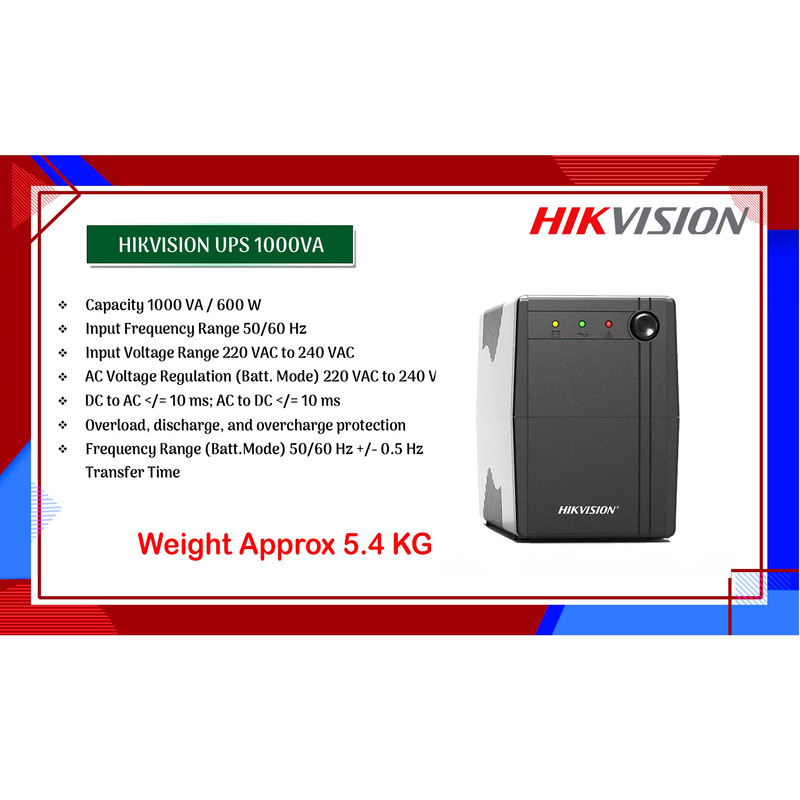 یو پی اس هایک ویژن مدل لاین اینتراکتیو با ظرفیت 1000 ولت آمپر (1KVA) دارای یک عدد باتری خارجی برند MHB 12 ولت 9 آمپر و دو خروجی استاندارد 220 ولت میباشد. همچنین دارای استابلایزر برای جلوگیری از نوسانات برق و کلید مکانیکی روشن و خاموش جهت روشن و خاموش کردن کلی دستگاه میباشد.