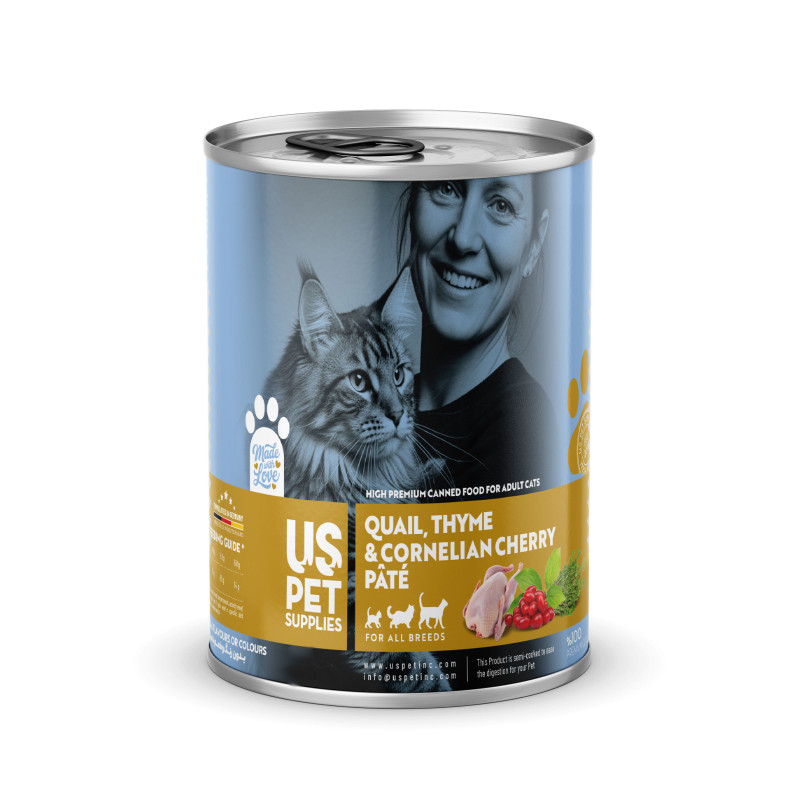 کنسرو غذای گربه بالغ یو اس پت مدل های پریمیوم طعم بلدرچین زغال‌اخته و آویشن وزن 800 گرم