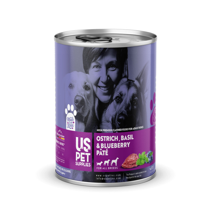 کنسرو غذای سگ یو اس پت مدل های پریمیوم طعم شترمرغ، ریحان و بلوبری وزن 800 گرم