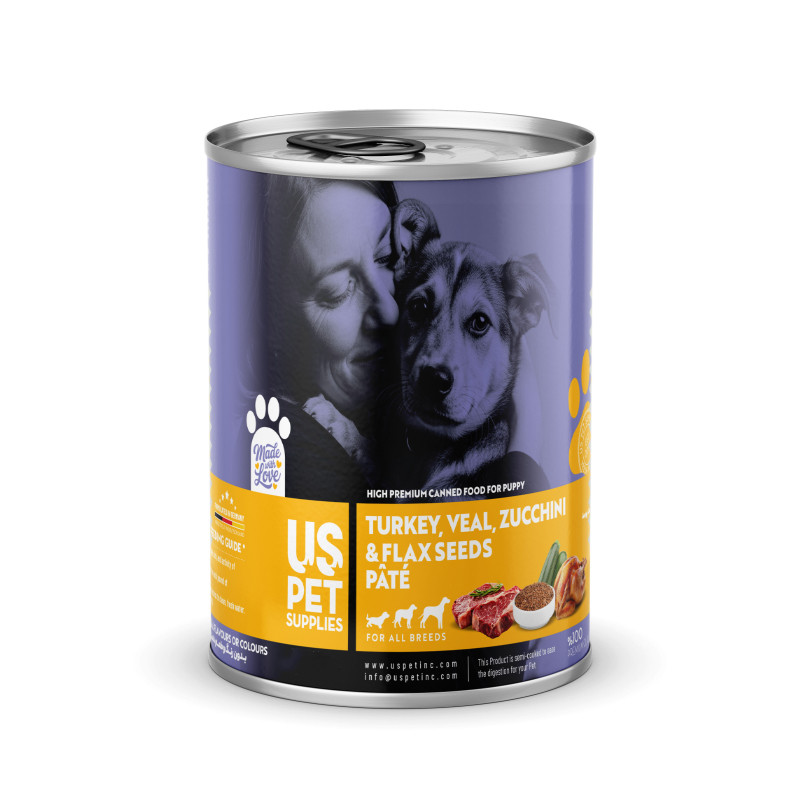کنسرو غذای توله سگ یو اس پت مدل های پریمیوم طعم گوساله، بوقلمون، کدو و تخم کتان وزن 800 گرم