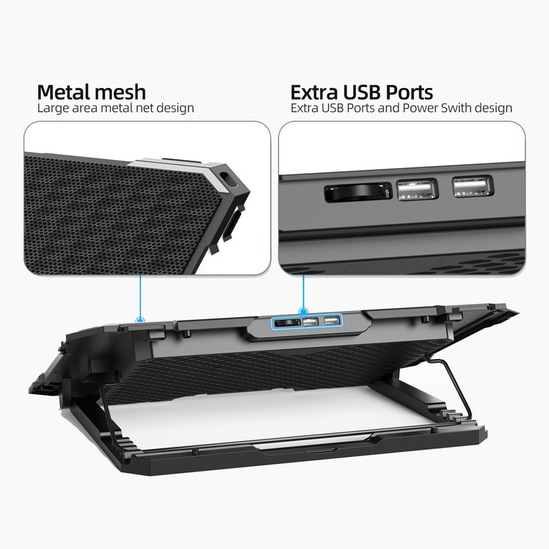 در پشت این کول پد دو پورت USB قرار داده شده است. یکی از این پورتها برای جبران پورتی که کول پد از لپتاپ اشغال میکند و دیگری یک پورت اضافه است تا بتوانید هر دستگاهی را که مد نظرتان است به لپتاپ متصل کنید.
