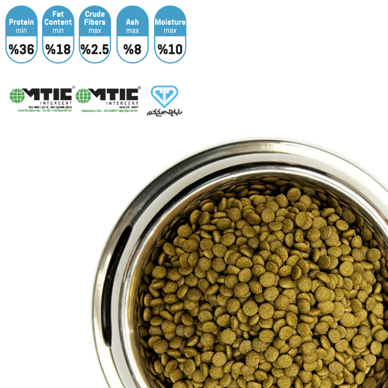 پروتئیــن طیــور، کنســانتره پروتئینــی گیاهــی، گلوتــن ذرت، پــودر ماهــی، برنــج، نشاســته ســیب زمینــی، آرد گنــدم، ذرت، چغنــدر (قندگیــری شــده)، پــودر جلبــک دریایــی، مخمــر هیدرولیــز شــده (منبــع مانــان الیگــو ســاکارید و بتاگلــوکان)، چربــی طیــور، روغــن ماهــی، روغــن ســویا، لســیتین، یــوکا، پســیلیوم، مکمــل معدنــی، مکمــل ویتامینــه، ال-کارنیتیــن، توریــن، کولیــن کلرایــد، مکمــل اســید آمینــه، کلینوپتیولیــت میکرونیــزه، عصاره های گیاهی، اسیدهای آلی و آنتی اکسیدان