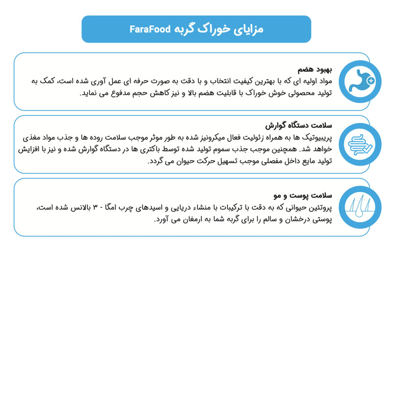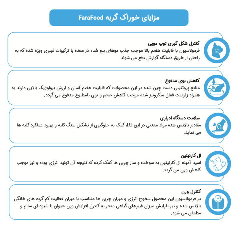 + کنترل شکل گیری توپ مویی: فرمولاسیون با قابلیت هضم بالا موجب جذب موهای بلع شده در معده با ترکیبات فیبری ویژه شده که به راحتی از طریق دستگاه گوارش دفع می شوند.