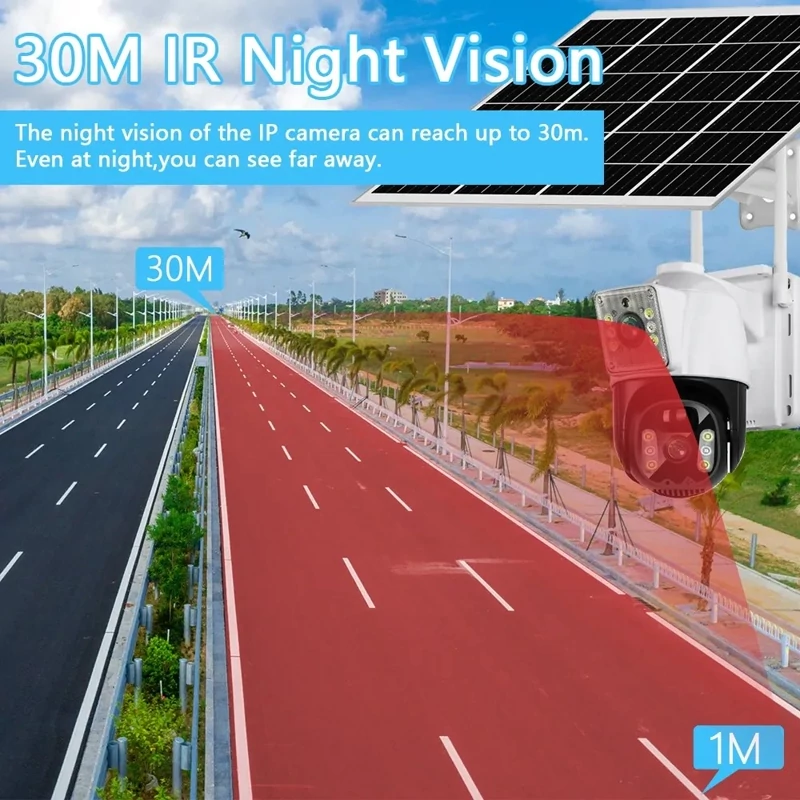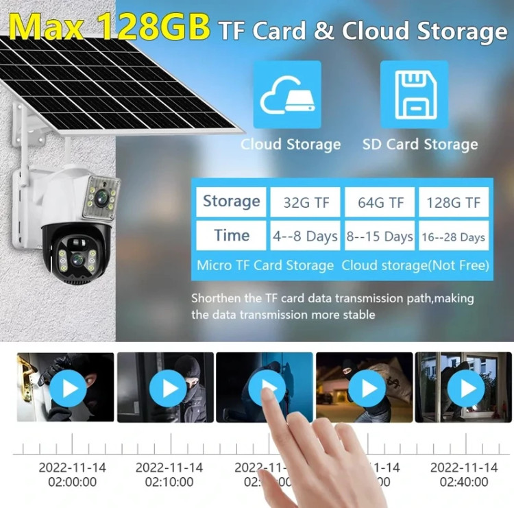 با باتری قابل شارژ، نیازی به برق مستقیم ندارید. دوربین را با باتری قوی 18650mAh شارژ کنید و به مدت طولانی از آن استفاده کنید. همچنین، با استفاده از پنل خورشیدی 10 وات، انرژی خورشیدی را بهرهبرداری کنید و بدون نیاز به اتصال به برق، دوربین را به طور پایدار تامین کنید.